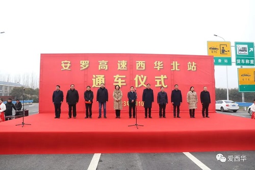 2月10日,西华县举行安罗高速西华北站开通仪式。刘贡献、周晓燕、朱良孝、段晓、韩秀娟、张国玉、龙文钦、张权等县领导,以及河南省交投集团航空港管理处党委书记司世明出席开通仪式。