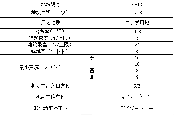 C-12地块用地性质性质为中小学用地,用地代码为080403。