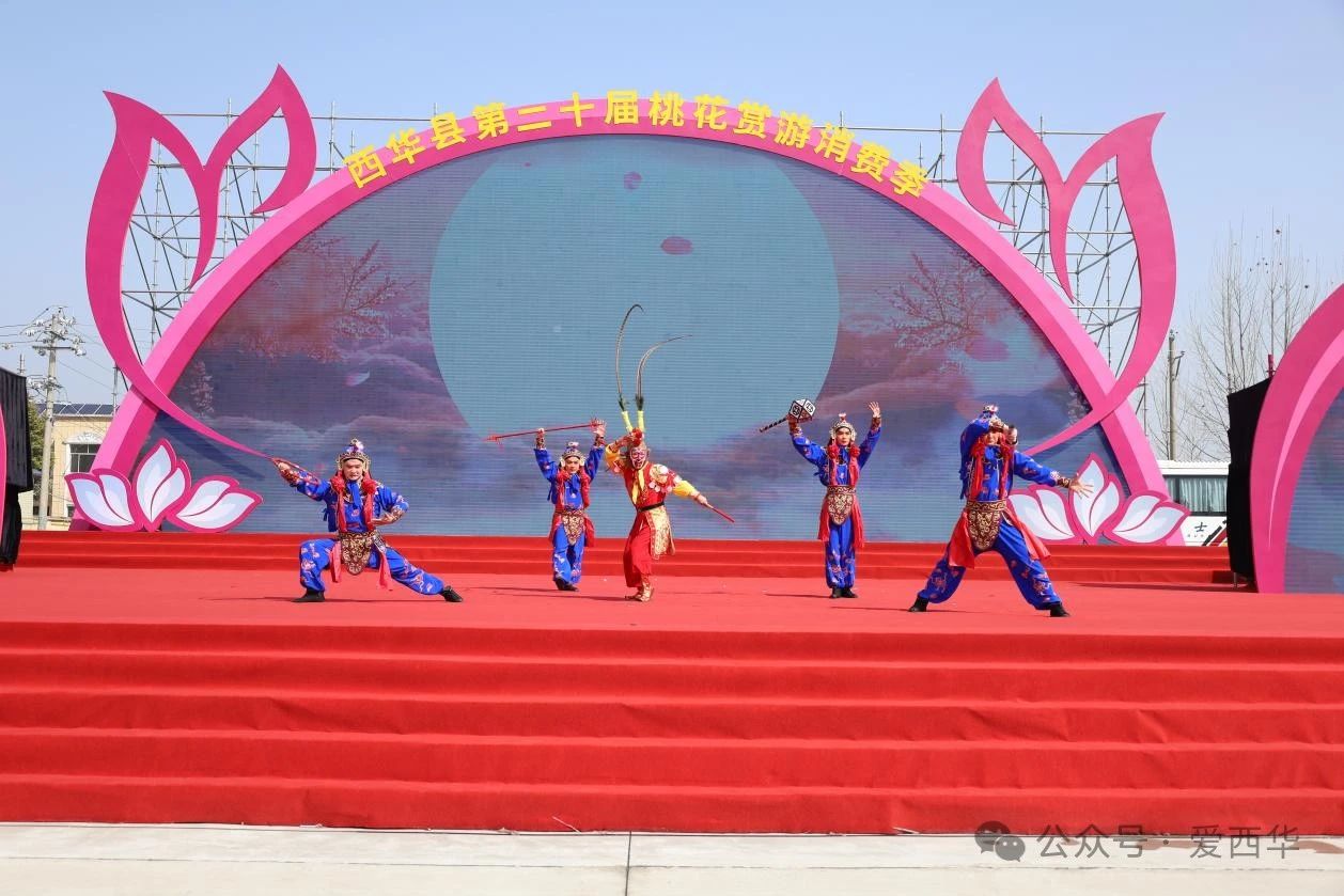 开幕式在开场舞《龙腾盛世》中拉开帷幕,童声诵读+歌曲《咏桃》、喷空《娲城新气象》、歌曲串烧《上春山》《桃花朵朵开》《桃花笑》、情景表演《猴王闹桃园》、舞蹈《桃花夭》、戏歌《你家在哪里》和歌舞《在那桃花盛开的地方》等一个个精彩节目轮番上演,赢得了现场观众的阵阵掌声,更是把西华县第二十届桃花赏游消费季活动开幕式推向了高潮。