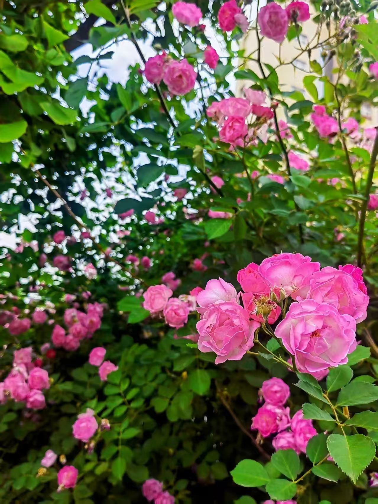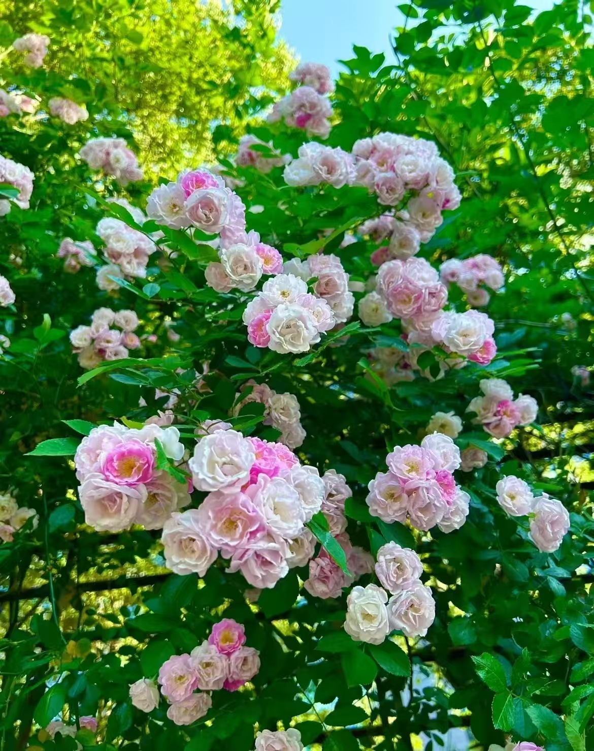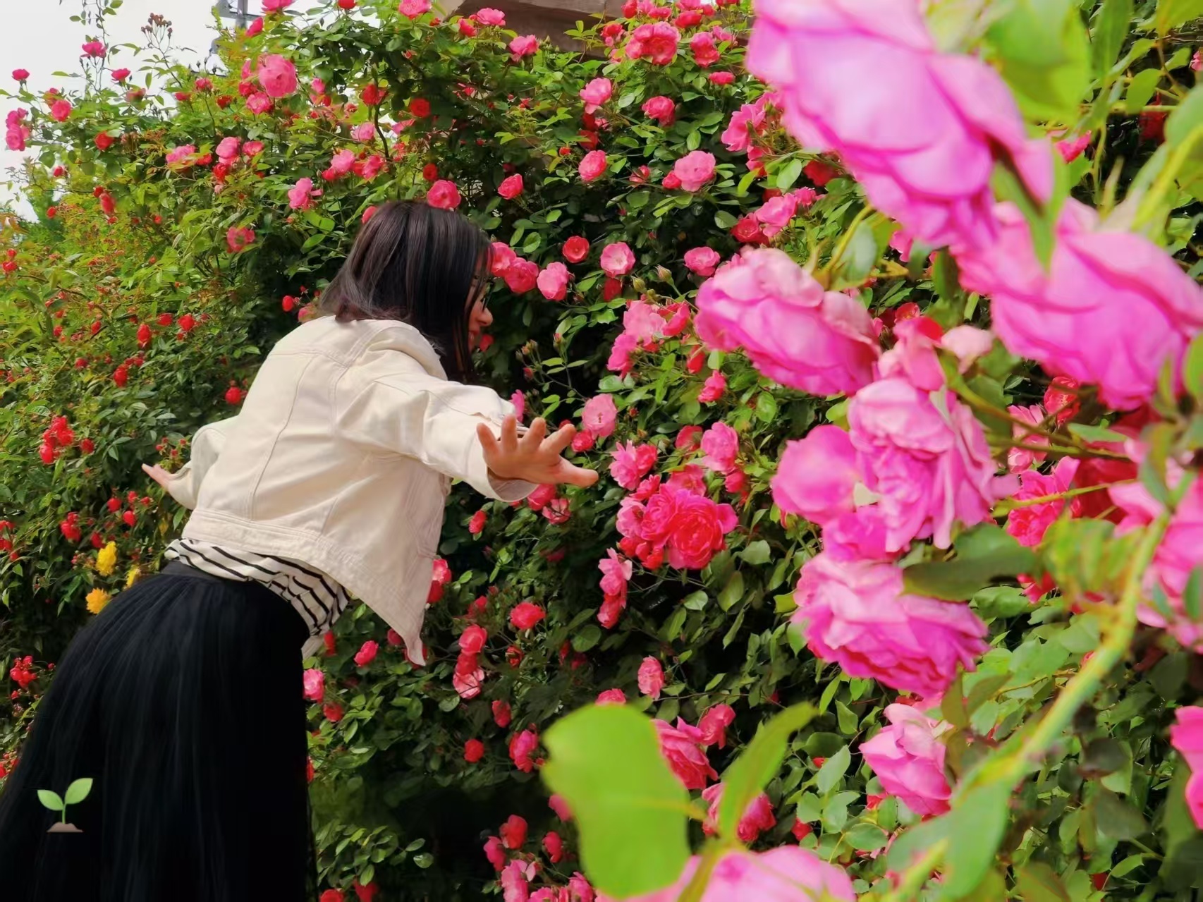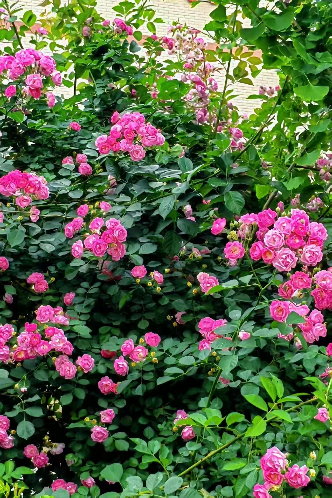 2025年4月27日,河南省周口市西华县大街小巷的围栏和围墙上,一簇簇、一丛丛蔷薇花开正艳,盛开的蔷薇花引来不少市民游客驻足拍照打卡。图为蔷影醉春芳。荆贺敏 摄