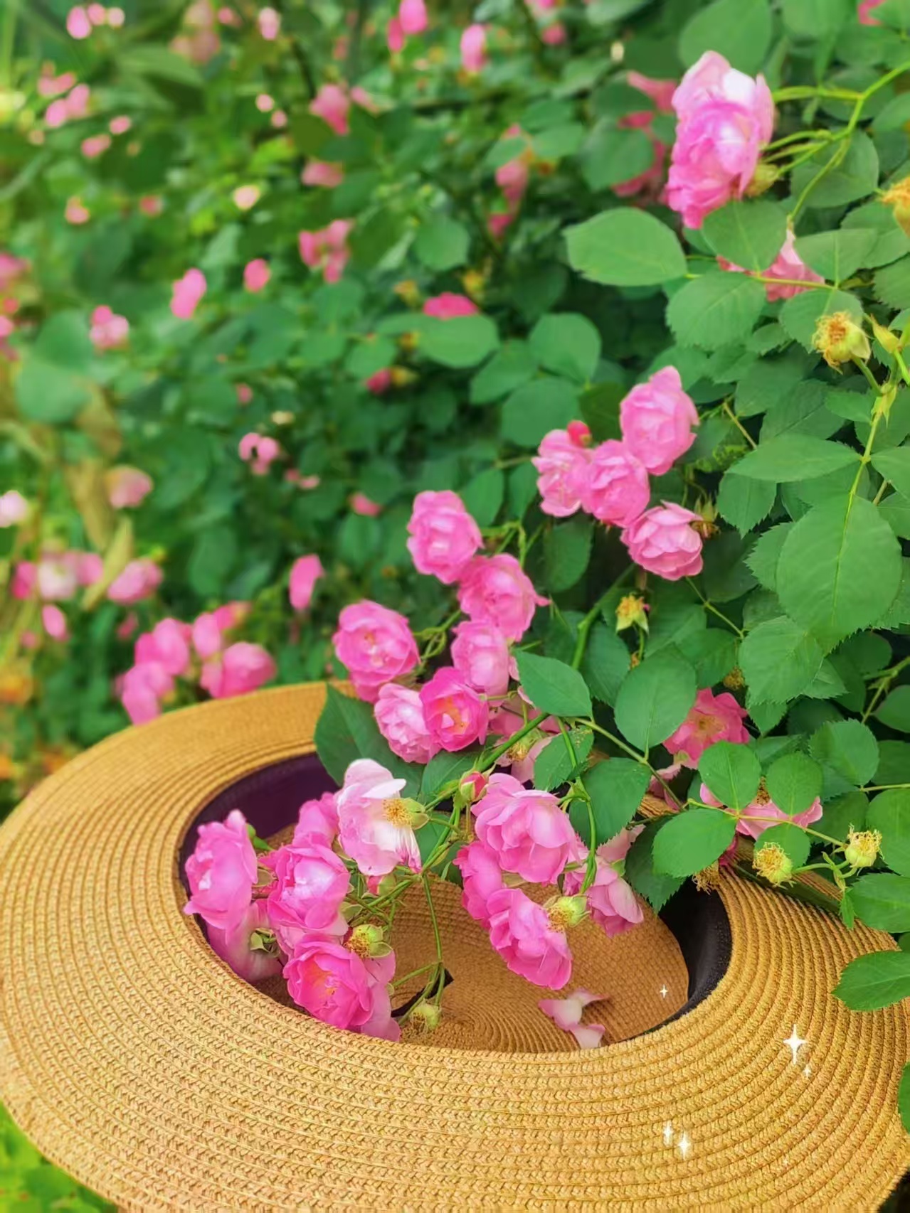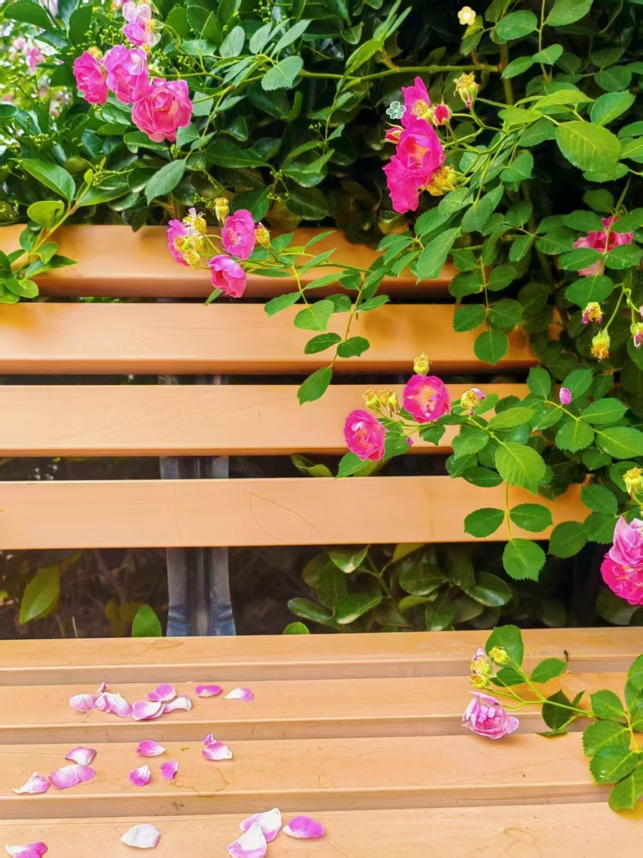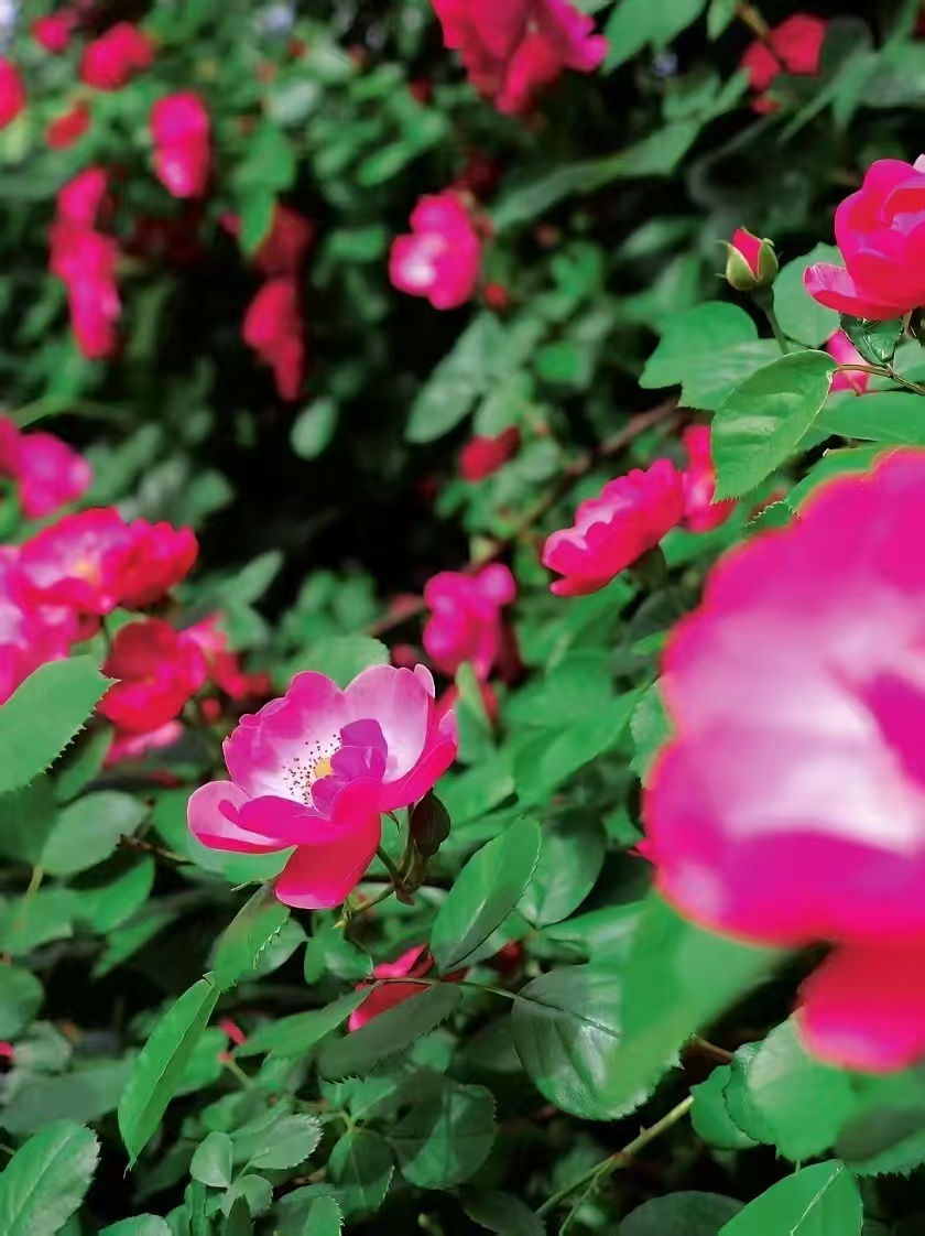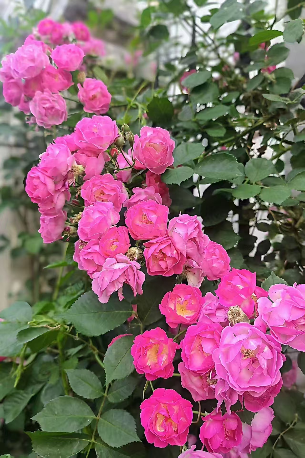 2025年4月27日,河南省周口市西华县大街小巷的围栏和围墙上,一簇簇、一丛丛蔷薇花开正艳,盛开的蔷薇花引来不少市民游客驻足拍照打卡。图为蔷影醉春芳。荆贺敏 摄