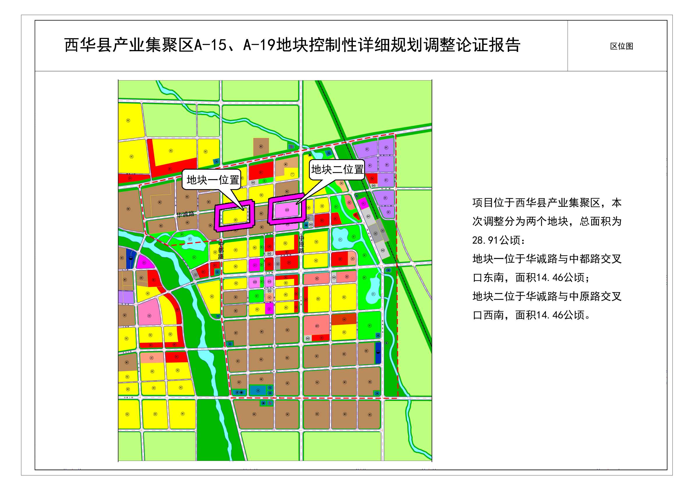 为提高规划的科学性和民主性,建立公众参与机制,根据《中华人民共和国城乡规划法》、《城市规划编制办法》和《河南省实施<中华人民共和国城乡规划法>办法》有关规定,规划报送审批前应进行公示,充分征求社会公众的意见,修改完善后报上级部门审批。现对《西华县产业集聚区A-15、 A-19地块控制性详细规划调整论证报告》进行公示。欢迎社会各界人士积极参与,提出宝贵意见和建议。