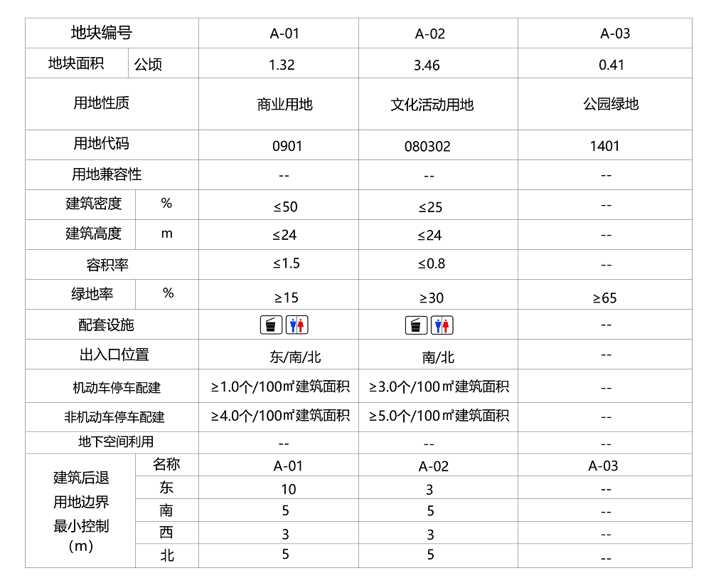 A-01地块用地性质为商业用地(0901),用地面积约为1.32公顷;A-02地块用地性质为文化活动用地(080302),用地面积约为3.46公顷;A-03地块用地性质为公园绿地(1401),用地面积约为0.41公顷。