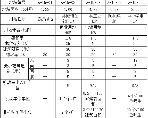 A-15-01为防护绿地(1402);A-15-02为二类城镇住宅用地(070102);A-15-03为二类工业用地(100102);A-15-04为防护绿地(1402);A-15-05为中小学用地(080403)。