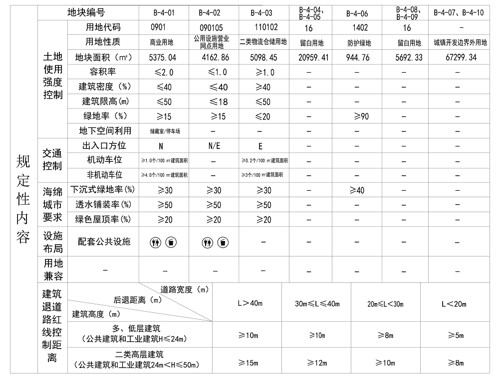 B-4街坊内用地性质为公园绿地、二类居住用地,其中,二类居住用地容积率<1.8,建筑密度<25%,建筑限高60米,绿地率≥35%,机动车出入口方位西、东、南;公园绿地绿地率≥70%。