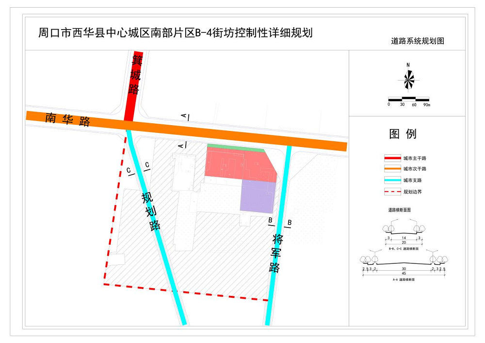 依据《西华县国土空间总体规划(2021-2035年)》及《周口市西华县中心城区南部片区控制性详细规划》,南华路为城市次干路,道路红线宽度为45米;将军路、规划路为城市支路,道路红线宽度均为20米。