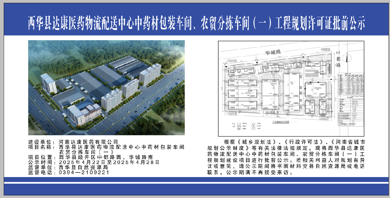 西华县达康医药物流配送中心中药材包装车间、农贸分拣车间(一)工程规划许可证批前公示