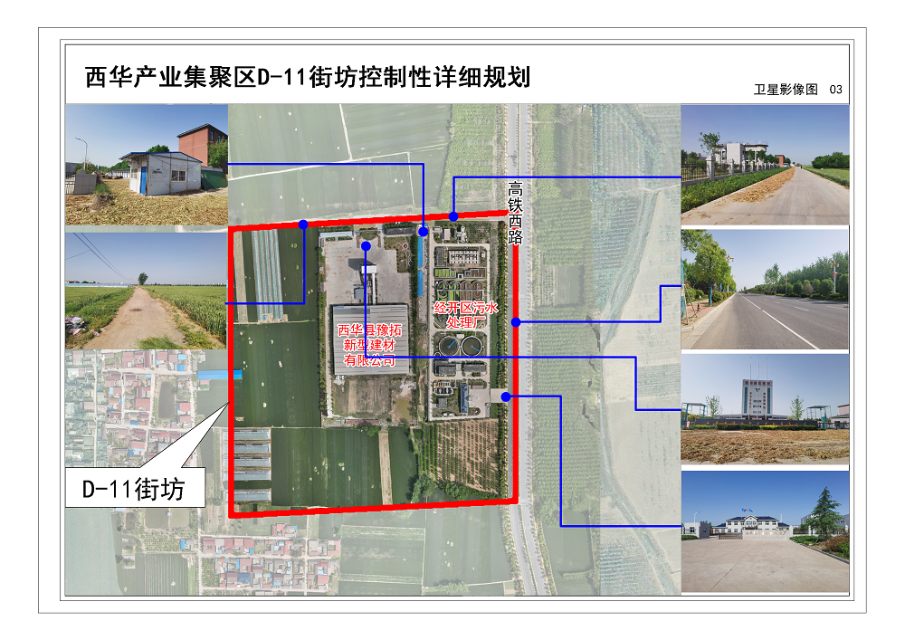 D-11街坊西侧高铁西路已建成,街坊北侧道路水泥硬化至西华县豫拓新型建材有限公司,其余道路均未修建;街坊内部紧邻高速西路地块为经开区污水处理厂,污水处理厂西侧为西华县豫拓新型建材有限公司,南侧有一处坑塘,其余为耕地、林地、设施农用地,街坊西侧、南侧为后半坡李村。现状高铁西路道路宽度40米。