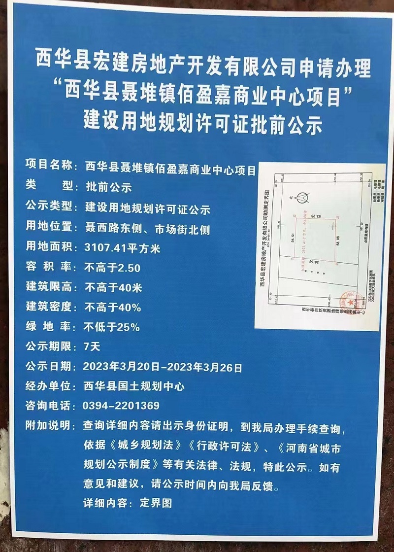西华县宏建房地产开发有限公司申请办理“西华县聂堆镇佰盈嘉商业中心项目”建设用地规划许可证批前公示