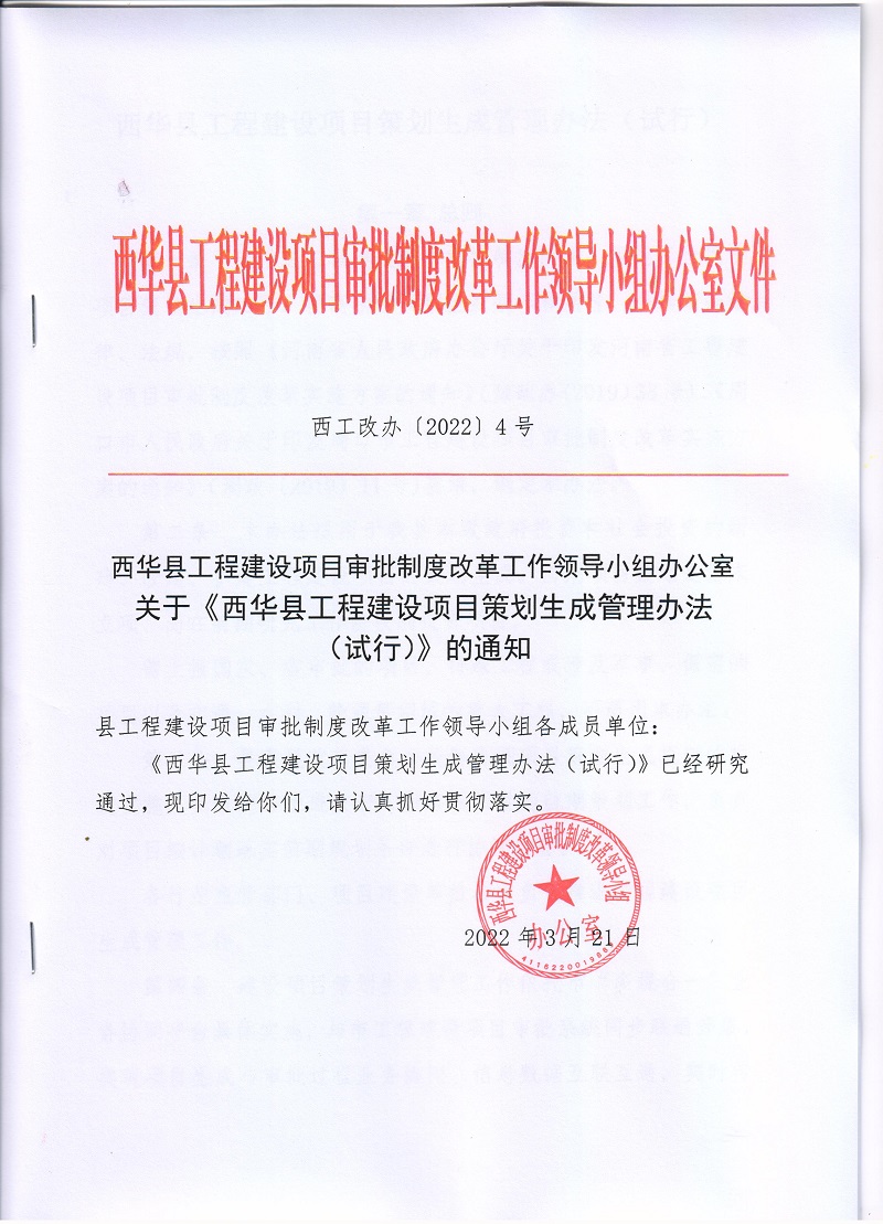 西华县工程建设项目审批制度改革工作领导小组办公室关于《西华县工程建设项目策划生成管理办法(试行)》的通知