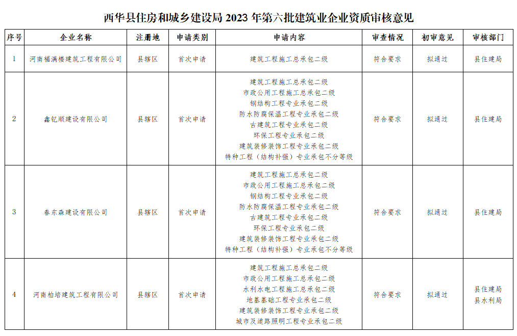 西华县住房和城乡建设局关于2023年第六批建筑业企业资质审核情况的公示