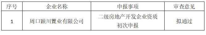 依据相关法律、法规以及《河南省住房和城乡建设厅关于房地产开发企业二级资质审批有关问题的意见》(豫建房〔2021〕253号),我局对周口颖川置业有限公司申请二级房地产开发资质的申报材料进行了审查,现将审核意见予以公示,公示期为2023年12月13日至2023年12月21日。