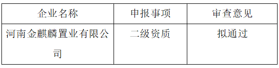 依据相关法律、法规以及《河南省住房和城乡建设厅关于房地产开发企业二级资质审批有关问题的意见》(豫建房〔2021〕253号),我局对河南金麒麟置业有限公司申请二级房地产开发资质的申报材料进行了审查,现将审核意见予以公示,公示期为2025年4月24日至2025年5月6日。