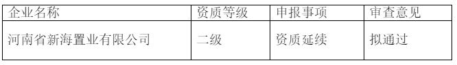 依据相关法律法规以及河南省住房和城乡建设厅的有关规定,我局对河南省新海置业有限公司申请二级资质延续的申报材料进行了审查,现将审核意见予以公示,公示期为2025年3月14日至2025年3月24日。