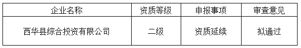 依据相关法律法规以及河南省住房和城乡建设厅的有关规定,我局对西华县综合投资有限公司申请二级资质延续的申报材料进行了审查,现将审核意见予以公示,公示期为2023年6月27日至2023年7月5日。