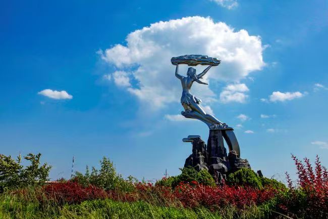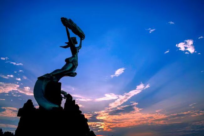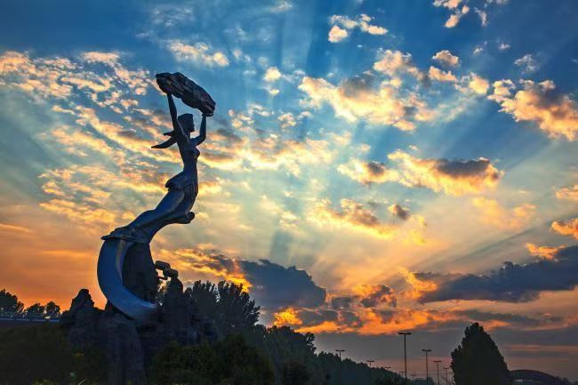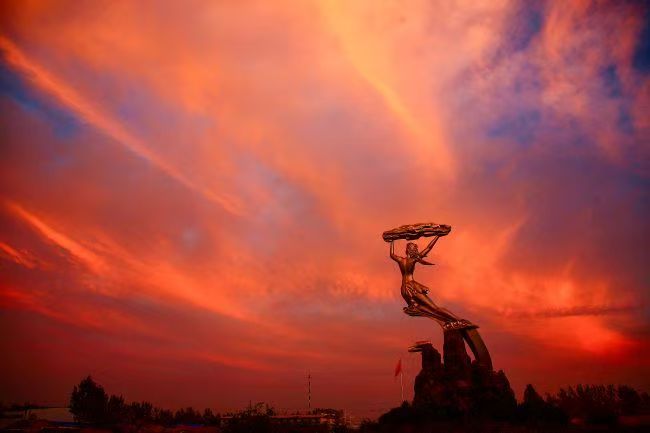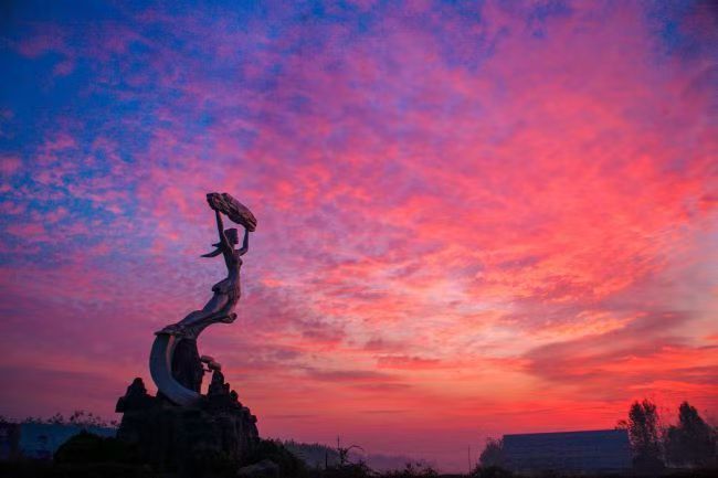 2024年8月7日,河南省周口市西华县摄影爱好者用镜头捕捉云霞与女娲补天塑像相互辉映的美丽瞬间。图为女娲补天塑像。肖海清 摄
