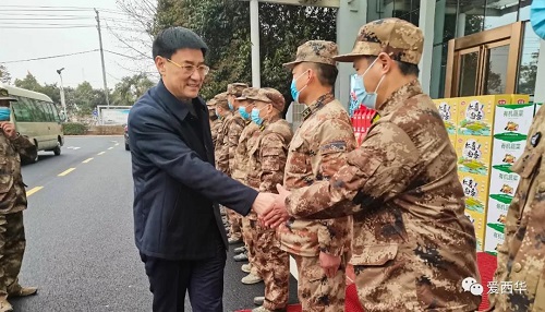 1月27日,西华县委书记田林带队到县人武部走访慰问,为部队官兵送去慰问品并致以节日问候。郭峰(县委副书记)、宋煜、段晓、黄河、张国玉、庞有敬、宋厂院等县领导参加慰问。