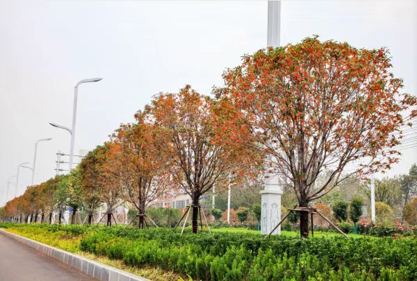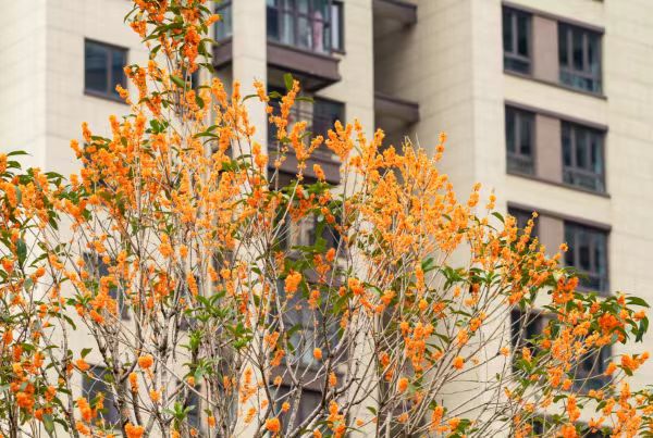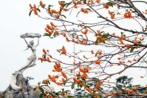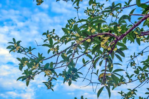 2023年10月10日,河南省周口市西华县城主要交通干道、公园、小区内,丹桂、金桂、银桂等各种桂花竞相怒放,形态万千,五彩缤纷,散发出沁人心脾的清香,整个县城都弥漫着桂花的香气。许多行人忍不住放慢脚步,伴着桂花的香味,在桂花树下驻足欣赏,拍照留念。图为路边桂花 肖海清 摄