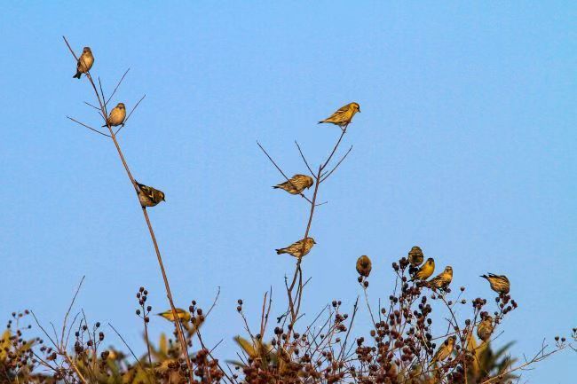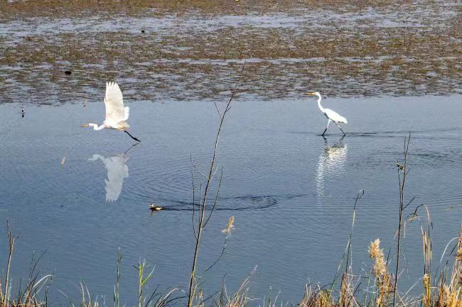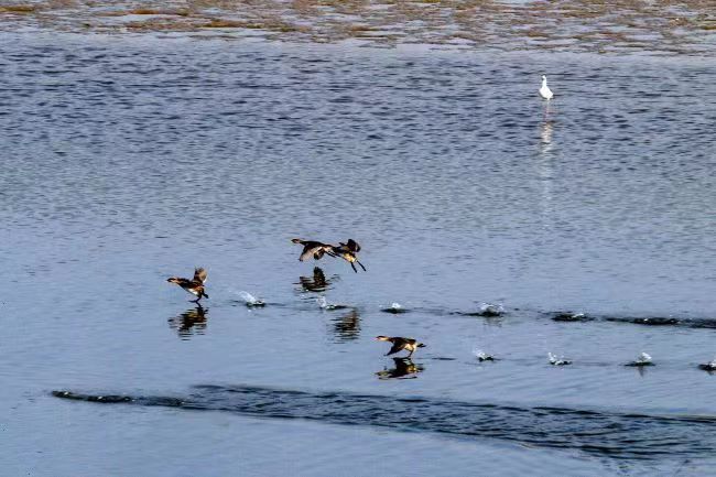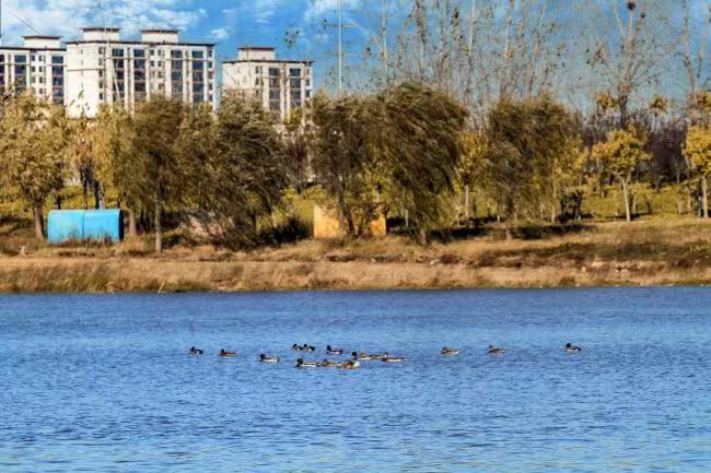 2023年12月9日,河南省周口市西华县贾鲁河湿地公园,冬日阳光明媚,天蓝水清,草木金黄,一派宁静与祥和。湿地公园良好的生态环境吸引了众多鸟类来此栖息。图为鸟儿在空中飞舞。