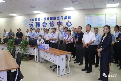 观摩组来到西华县人民医院,听取医院会诊转诊一站式服务、智能导航服务、医保电子凭证全场景应用服务、诊间支付服务、病区结算服务和病案复印线上线下一体化服务介绍,详细了解远程影像中心、远程会诊中心、卒中中心建设情况。