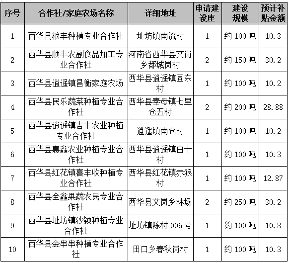 根据《河南省农业农村办公厅 河南省财政厅关于印发<2021年河南省全面推进农产品产地冷藏保鲜设施建设工作实施方案>的通知》(豫农文〔2021〕168号)精神,我县于2021年6月22日,将项目建设申报有关事项予以公示。经新型农业经营主体自愿申报,县农业农村局通过新型农业经营主体信息直报系统,对拟建设主体提交的材料进行认真审核,并现场实地考察后,遴选了符合要求的10个建设主体,共建设13座冷藏设施。现将2021年西华县农产品产地冷藏保鲜设施建设项目予以公示,公示期为7天(2021年11月9日—11月15日),如有异议,请在公示期内向县农业农村局办公室反映或向有关部门提出意见。公示期满,如无异议,建设主体即按公示内容实施建设,如不符合设施建设验收标准,将取消相关补贴资金。