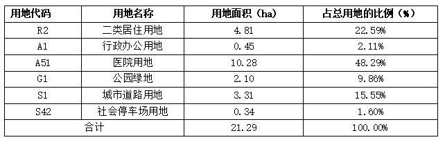 规划用地由二类居住用地(R2)、行政办公用地(A1)、医院用地(A51)、公园绿地(G1)、城市道路用地(S1)、社会停车场用地(S42)六类建设用地组成,共包含7个地块。