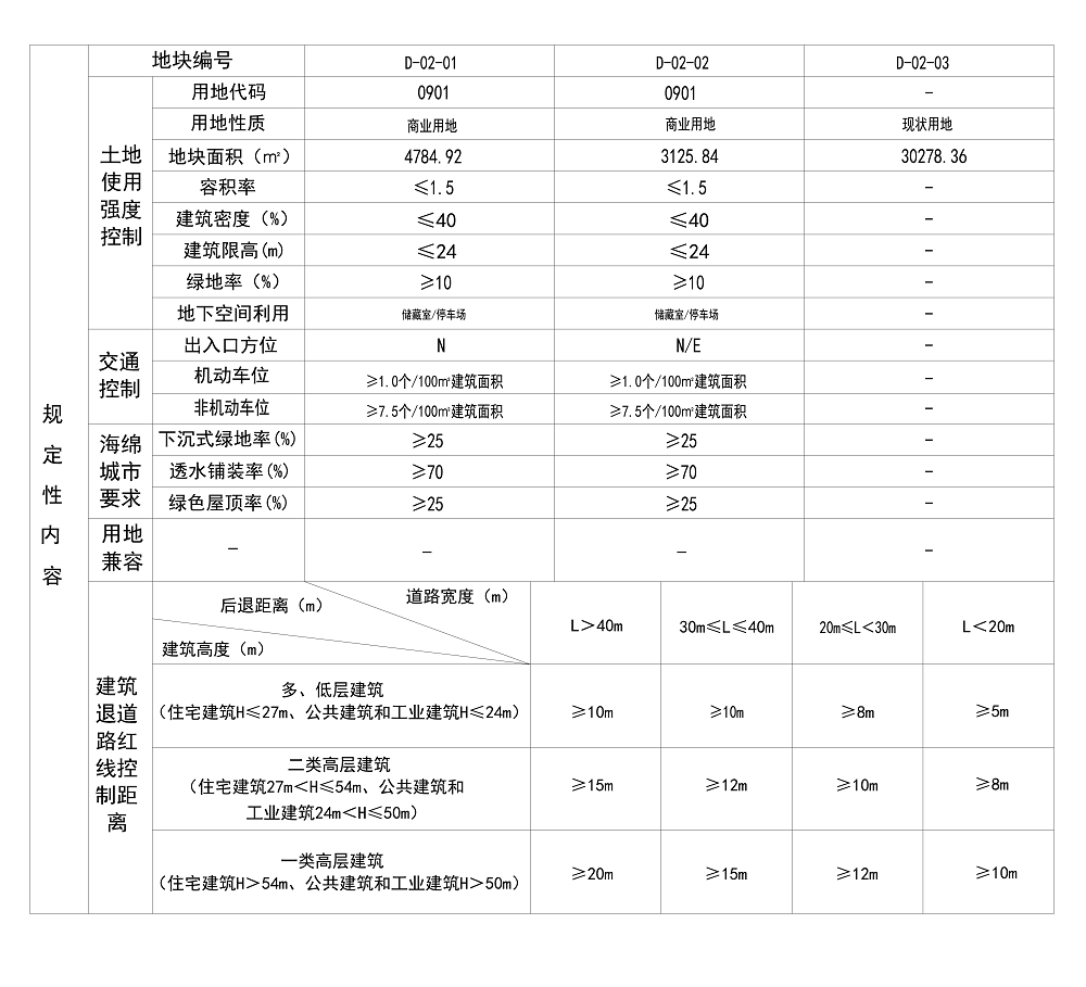 本次规划D-02街坊编号不变,本次规划地块以D-02-01、D-02-02、D-02-03进行编号。其中D-02-01、D-02-02用地性质为商业用地(0901),D-02-03为保留现状用地。