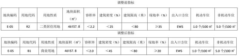 本次调整具体为E-05宗地。为加快城市建设步伐及县城经济战略发展规划,进行如下调整:将原E-05宗地用地性质由二类居住用地(R2)调整为商业用地(B1)。