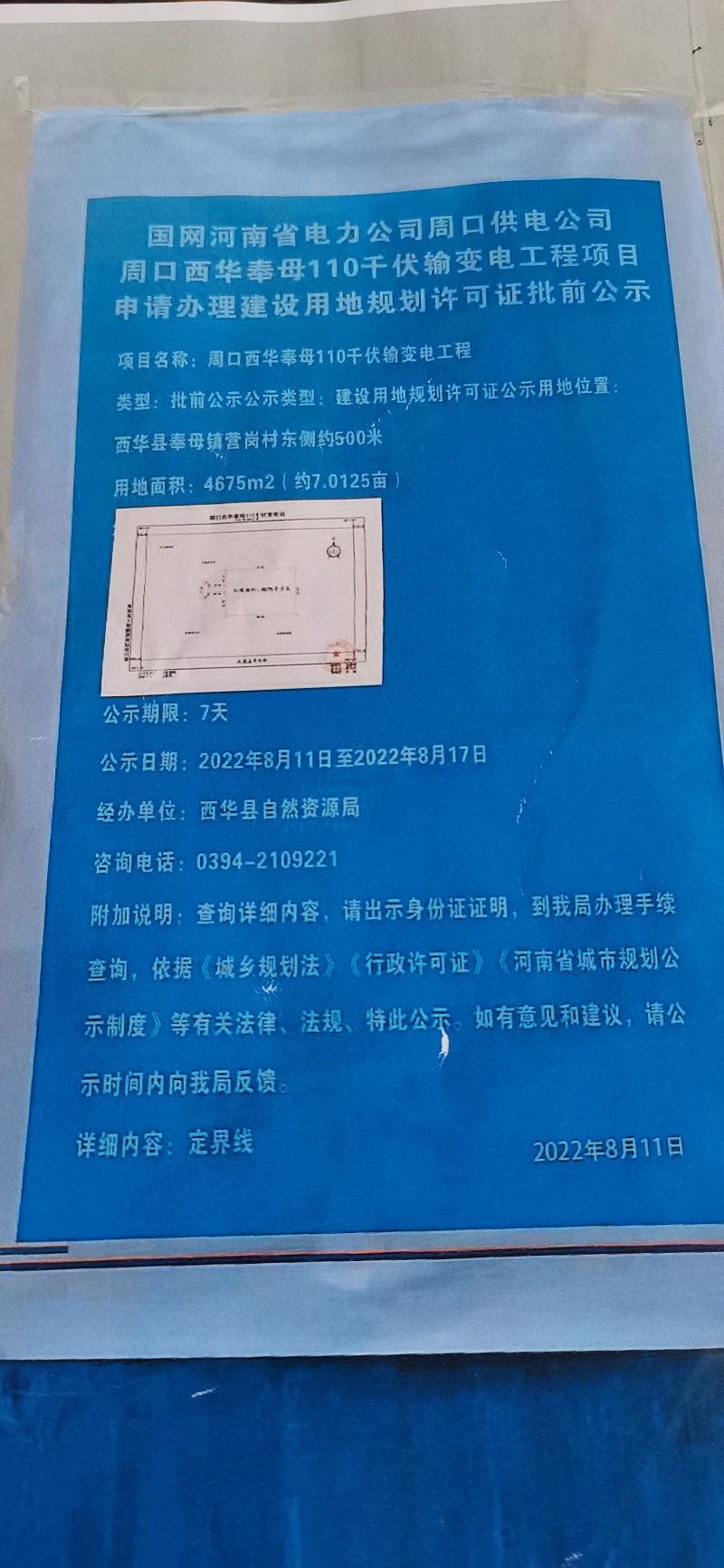 国网河南省电力公司周口供电公司周口西华奉母110千伏输变电工程项目申请办理建设用地规划许可证批前公示