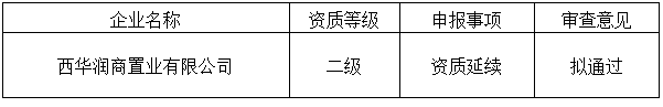 依据相关法律法规以及河南省住房和城乡建设厅的有关规定,我局对西华润商置业有限公司申请二级资质延续的申报材料进行了审查,现将审核意见予以公示,公示期为2023年5月29日至2023年6月6日。