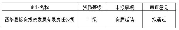 依据相关法律法规以及河南省住房和城乡建设厅的有关规定,我局对西华县豫资投资发展有限责任公司申请二级资质延续的申报材料进行了审查,现将审核意见予以公示,公示期为2023年2月15日至2023年2月23日。