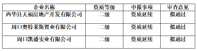 依据相关法律法规以及河南省住房和城乡建设厅的有关规定,我局对西华县天福房地产开发有限公司等三家企业,申请二级资质延续的申报材料进行了审查,现将审核意见予以公示,公示期为2024年10月18日至2024年10月28日。