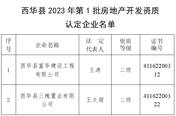 根据《房地产开发企业资质管理规定》(建设部令第77号)和《河南省住房和城乡建设厅关于进一步规范房地产开发企业资质管理工作的通知》(豫建房管[2016]35号)的有关规定,我局对2023年第1批申请房地产开发资质的企业申报材料进行了审查,并将审查结果进行了公示。经研究,批准西华县富华建设工程有限公司等2家企业为二级资质房地产开发企业。