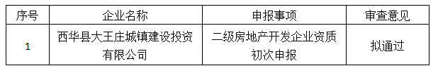 依据相关法律、法规以及《河南省住房和城乡建设厅关于房地产开发企业二级资质审批有关问题的意见》(豫建房〔2021〕253号),我局对西华县大王庄城镇建设投资有限公司申请二级房地产开发资质的申报材料进行了审查,现将审核意见予以公示,公示期为2023年10月10日至2023年10月18日。