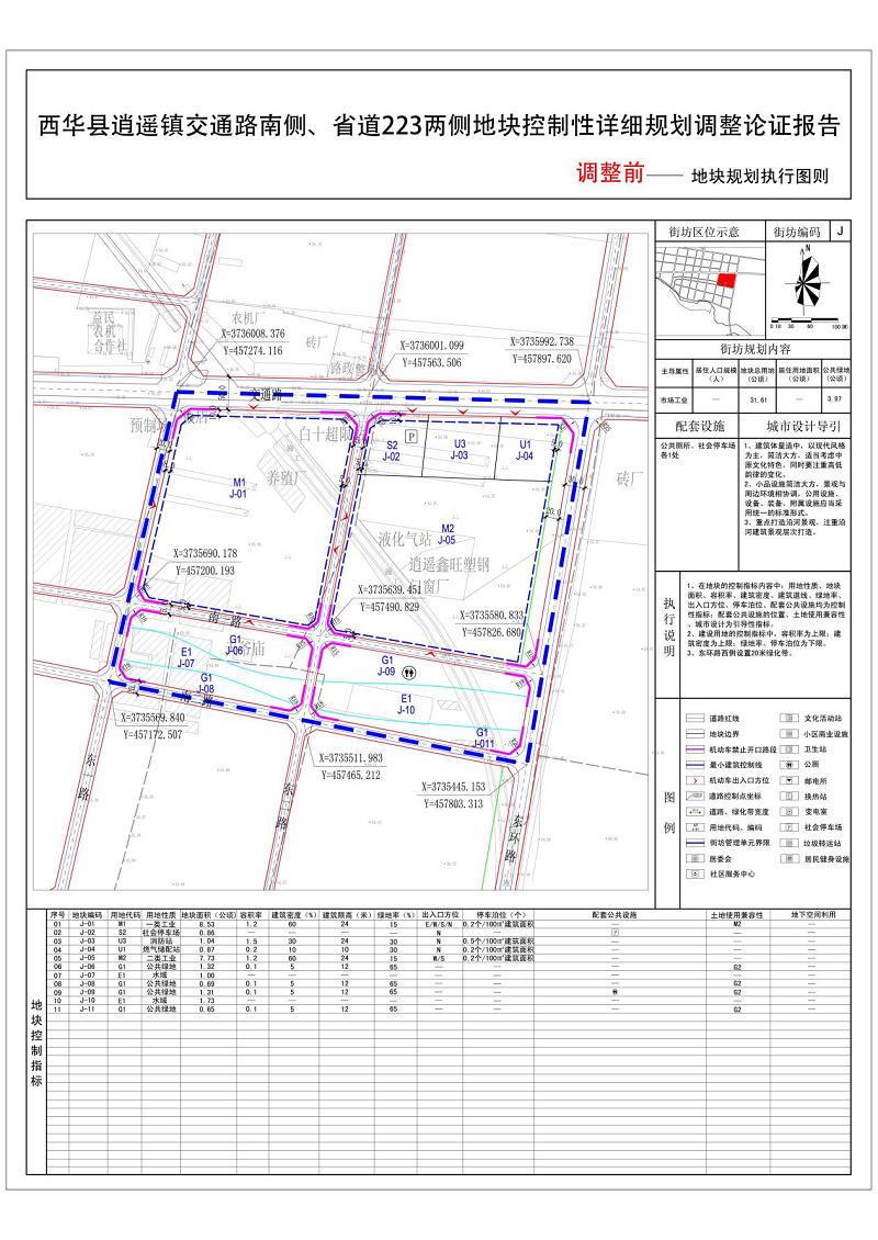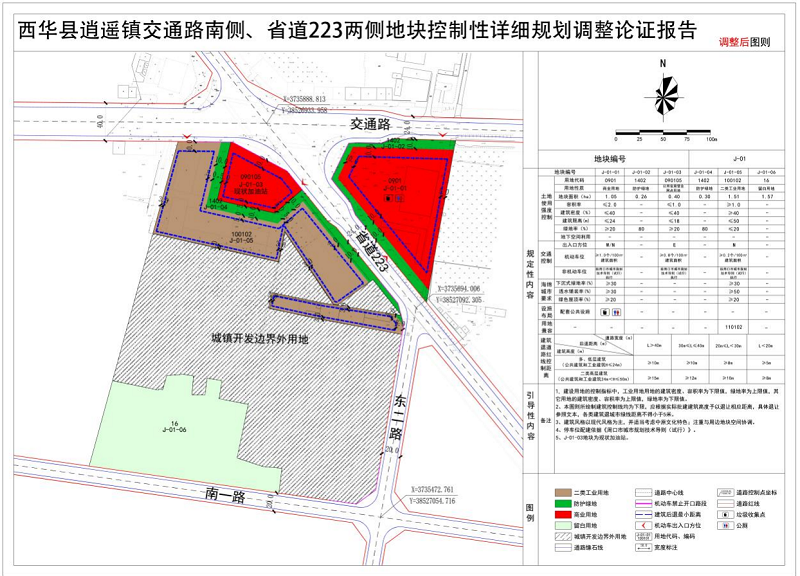 由于原J-01地块用地性质由一类工业用地调整为商业用地、公用设施营业网点用地、二类工业用地、防护绿地、留白用地及城镇开发边界外用地。结合修建性详细规划方案与技术指标,对相对应的地块控制指标进行调整。规划J-01-01地块商业用地(0901)容积率小于等于2.0,建筑密度小于等于40%,建筑限高为24米,绿地率大于等于20%,机动车出入口方位西、北,商业用地机动车停车配建标准为1.0个/100㎡建筑面积,非机动车停车配建根据后期建设业态参照《周口市城市规划技术导则》(试行)执行。J-01-03为现状加油站,规划为公用设施营业网点用地(090105),容积率小于等于1.0,建筑密度小于等于40%,建筑限高为18米,绿地率大于等于20%,机动车出入口方位东,机动车停车配建标准为0.8个/100㎡建筑面积,非机动车停车配建参照《周口市城市规划技术导则》(试行)执行。J-01-05规划为二类工业用地(100102),容积率大于等于1.0,建筑密度大于等于40%,建筑限高为50米,绿地率小于等于20%,机动车出入口方位北,机动车停车配建标准为0.2个/100㎡建筑面积,非机动车停车配建参照《周口市城市规划技术导则》(试行)执行,用地兼容二类物流仓储用地(110102)。