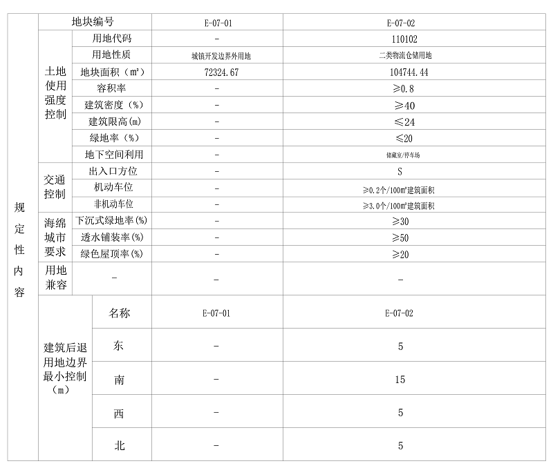 调整后,E-07-02为二类物流仓储用地(110102)容积率≥0.8,建筑密度≥40%,建筑限高≤24米,绿地率≤20%,地块机动车出入口方位为南侧。