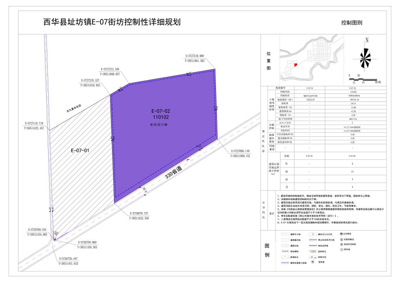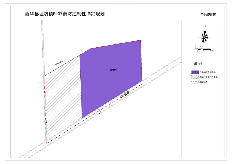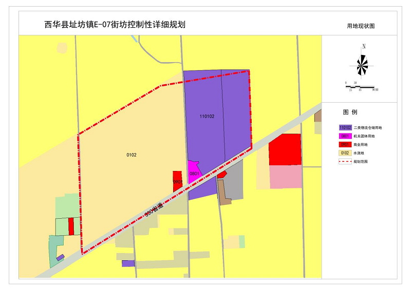 本次规划E-07街坊编号不变,本次规划地块以E-07-01、E-07-02进行编号。其中E-07-01为城镇开发边界外用地;E-07-02地块为二类物流仓储用地(110102)。