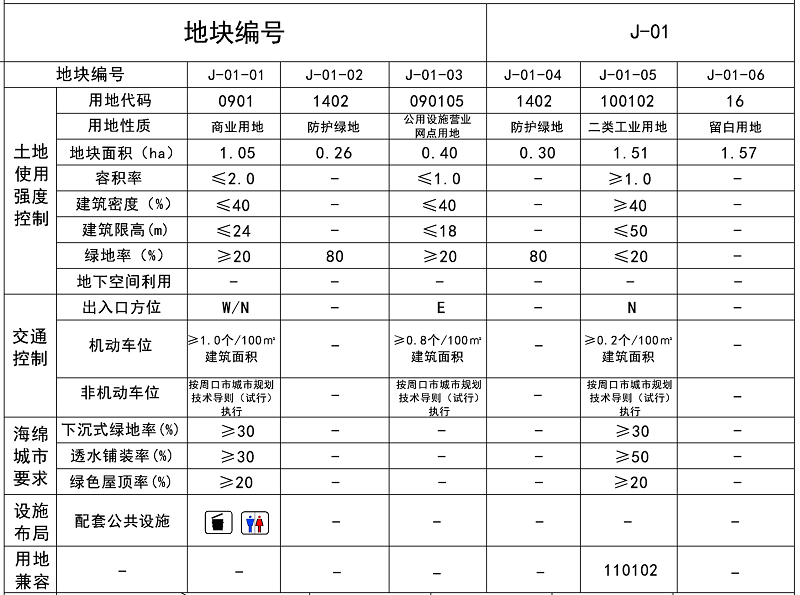本次规划街坊编号J-01,本次规划地块以J-01-01、J-01-02、J-01-03、J-01-04、J-01-05、J-01-06进行编号。