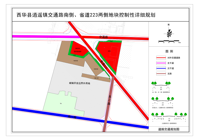 规划街坊周边市政道路呈方格网状,道路分四级:对外交通道路、主干道、次干道、支路。依据现状建设情况和《逍遥镇国土空间总体规划(2021-2035年)》,本次规划交通路(省道223以东)红线宽度为24米,省道223以西红线宽度为40米,省道223红线宽度为24米,交叉口渠化路段按现状实际建设进行控制,东二路和南一路道路红线宽度均为20米,交通路(S223东)、省道S223两侧各控制10米的防护绿带。
